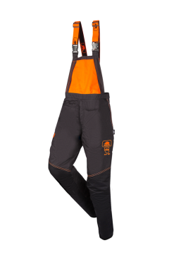 Luokka 1 tyyppi A mukainen viiltosuoja-avohaalari. Housuissa on tilava rintatasku, sivutaskut ja tukevat olkaimet. Elastinen vyötärö.